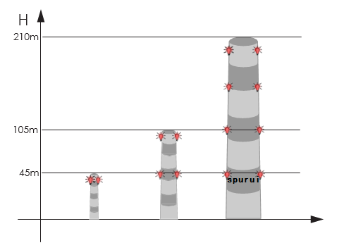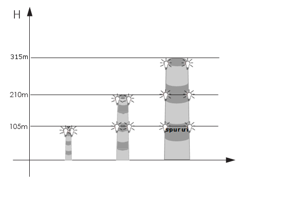 烟囱(冷却塔)是一种典型的圆柱形垂直结构,为锅炉、火炉、熔炉或壁炉中的热烟气或烟雾提供通风,使其进入外部大气。在烟囱、冷却塔和火炬烟囱的特殊情况下,航空障碍灯可以安装在顶部下方3-5米处,以避免沉积物和通常散发的热量的遮挡效果。